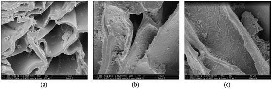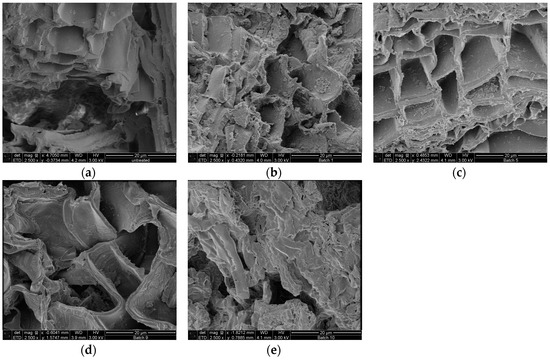 Scanning electrons microscopical observations of birch outer bark confirmed the existence of numerous cork (phellem) layers with an elongated polygonal shape (Figure 3a,b). After pretreatment, cell walls were ruptured to different extents. In case of hydrothermal and steam explosion treatment, cell walls are covered with residues (Figure 4b,c). Fragments of broken cell-walls also appear at some extent in all pretreatments of bark, illustrating the typical changes in structure of pretreated biomass. Surface residues markedly decrease as samples undergo organosolv treatments (Figure 4d and Figure 5a–c).