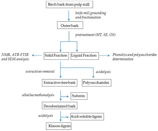 The analytical protocol applied in this work is illustrated in Figure 6. The bark from Betula pendula was obtained as residual by-product of commercial debarking at Smurfit Kappa pulp mills (Piteå, Sweden) with 4.5% of moisture and was ground in a knife mill (Retsch SM 3000, Haan, Germany) using an output sieve of 1 mm × 1 mm. After grounding, dry birch bark samples were soaked by mixing in distilled water. The outer bark fraction, which floated to the top of the water surface, was collected and dried [6,47]. Final moisture was 2%–3%. The mass retained was weighed and stored in plastic bags until pretreatment. Ash content before and after pretreatment was determined with incineration of the material at 550 °C overnight and weighing of the residues.