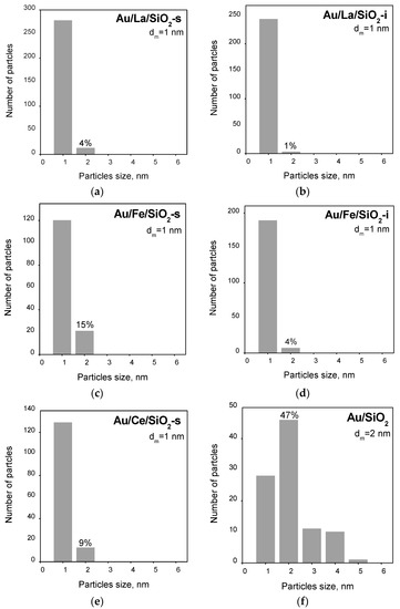 Figure 1 shows the size distribution of AuNPs on both unmodified silica and silica modified with metal oxide additives, e.g., La, Fe and Ce. It can be seen that the distributions of AuNPs on the modified supports (Figure 1a–e) are characterized by a high monodispersity with a predominant size of 1 nm. As it was reported in our earlier work [38], they were obtained by depositing gold on modified silica composed by SiO2 particles with very low size (2–4 nm). In Au/SiO2 (Figure 1f) the distribution of particles is wider, e.g., in the range of 1–5 nm with an average diameter of 2 nm. We also cannot exclude the existence of Au subnanometer species (undetectable by HRTEM) in the catalyst here studied.