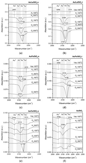 FTIR spectra of CO adsorbed on Au/La/SiO2-s (a); Au/La/SiO2-i (b); Au/Fe/SiO2-s (c); Au/Fe/SiO2-i (d); Au/Ce/SiO2-s (e); Au/ SiO2 (f) after different treatments.
