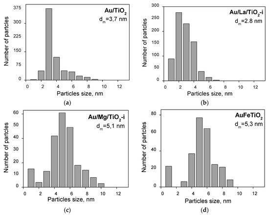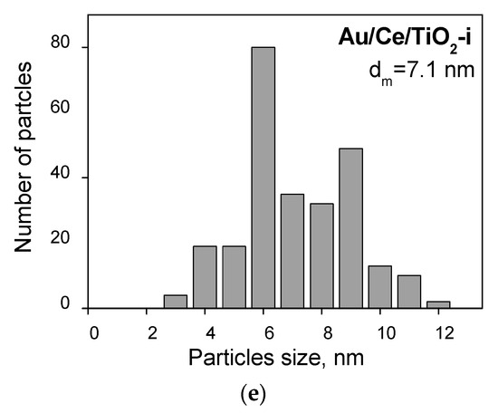 Au particle size distribution obtained by TEM for Au/TiO2 (a); Au/La/TiO2-i (b); Au/Mg/TiO2-i (c); Au/Fe/TiO2-i (d); Au/Ce/TiO2-i (e).