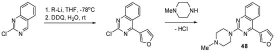 Many final products were obtained by nucleophilic displacement reaction of a halogen activated by an appropriately positioned ring nitrogen atom in pyrimidines, quinazolines and pyridines (Scheme 1 and Scheme 3, Scheme 4, Scheme 5, Scheme 6, Scheme 7 and Scheme 8). By using this methodology, 4-substituted 2-chloropyrimidine or 2-chloroquinazoline substrates were easily functionalized with amines to give the final products 1, 2, 21, 23, 24, 26, 29, 30, 32, 36–46, and 48. With 2,4-dichloropyrimidines, such nucleophilic displacement is regioselective, giving rise to 4-amino-2-chloropyrimidines, often with yields exceeding 90% [26]. In this work, the regioselective displacement reaction of 2,4-dichloro-6-(3-furyl)pyrimidine with dimethylamine at ambient temperature yielded a 2-chloro-4-dimethylamino intermediate product, the subsequent treatment of which with N-methylpiperazine at an elevated temperature furnished the final product 4-dimethylamino-6-(3-furyl)-2-(4-methylpiperazin-1-yl)pyrimidine (19). On the other hand, two consecutive introductions of heteroaryl groups at positions 4 and 6 of 2-chloropyrimidine followed by nucleophilic displacement of the 2-chloro atom yielded a variety of substituted pyrimidines 11–20, 22, 25, 27, 28, 31 (Scheme 1).