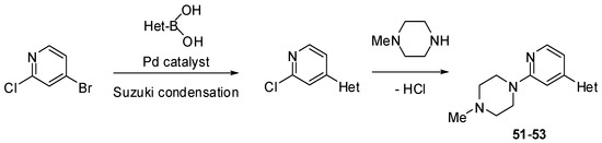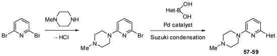 The Suzuki mono-coupling reaction of a dihalogeno-substituted pyridine with a heteroarylboronic acid followed by classical nucleophilic displacement of the second halogen were used to synthesize pyridine derivatives 51–59 (Scheme 6, Scheme 7 and Scheme 8). The reaction sequence depended on type of substrate used.