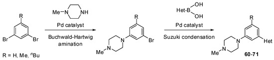 In case of benzene derivatives, Buchwald-Hartwig amination of halogeno-substituted benzenes with N-methylpiperazine in the presence of a palladium catalyst provided piperazine-substituted products (Scheme 9). The Suzuki condensation of these intermediate products with heteroarylboronic acids yielded the desired heteroaryl-substituted benzenes 60–71. It should be noted that the majority of the two-step reactions discussed above were conducted with crude intermediate products. However, the final products were rigorously characterized in all cases studied.
