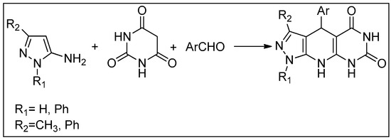 During our practical work, we observed that the reaction of ethyl acetoacetate and hydrazine hydrate proceeded smoothly and was completed rapidly [62,63] to afford 3-methyl-5-hydrazolone, virtually in quantitative yield. Thus, we decided to investigate the synthesis of pyrazolo-[4′,3′:5,6]pyrido[2,3-d]pyrimidine-diones via a one pot five component reaction (Scheme 2).