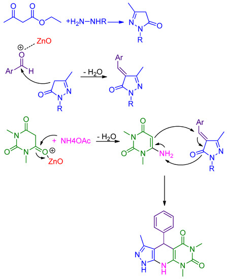 Considering this point that has now been turned into a fact, nowadays, a plethora of nanometal oxides are used as efficient catalysts in several of the organic transformations. Among other catalysts examined, we initially used ZnO and then selected nano-ZnO from analyzing our results obtained from sets of reactions, as a green catalyst. We have also found that the amount of our model reaction, and, in general, 0.04 g of nano-ZnO is the optimum amount of catalyst. Under optimized reaction conditions, using optimal amounts of nano-ZnO as heterogeneous catalyst in boiling water as solvent, we designed this four component reaction, providing the corresponding pyrazolo-[4′,3′:5,6]pyrido[2,3-d]pyrimidine-diones in high yield.