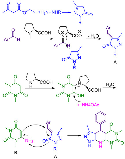 A solution of 3-methyl-pyrazol-5-one or 3-methyl-1-phenyl-pyrazole-5-one (1 mmol), 1,3-dimethyl barbitueic acid (1 mmol), ammonium acetat (1.2 mmol), benzaldehyde (1 mmol) and l-proline (0.04 g) in H2O (5 mL) was stirred under heating conditions for appropriate time. After completion of the reaction which was monitored by TLC, the mixture was cooled to room temperature. The solid product was collected by filtration, washed with water and aqueous ethanol and purified by recrystallization from CH2Cl2.