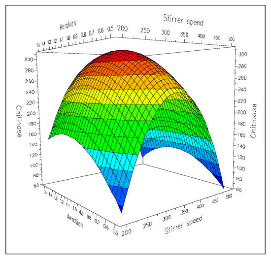 Response Surface Methodology (RSM) was employed to investigate the effects of combining stirrer speed (in the range 200–500 rpm) and aeration rate (in the range 0.5–1.5 vvm) [46]. Optimization of these fundamental process parameters was carried out using quantitative and quantitative-multilevel factors for aeration and agitation, respectively. The model (quadratic D-optimal) revealed high reliability and good statistical performance (R2, 0.931; Q2, 0.869). Maximum of activity (373.0 IU/L), under optimised conditions, was predicted at an intermediate stirring rate (ca. 327 rpm) and 1.1 vvm. However, the subsequent experimental confirmation of the model indicated that highest activity (383.7 IU/L) was achieved at 1 vvm and 300 rpm. Clearly, the enzyme production was strongly affected by the shear effects produced by high agitation and aeration rates (Figure 5). In bioreactors, under optimised conditions, the fungus produced a number of chitinolytic enzymes higher than those released in shaken flasks; moreover, production was 23% higher.