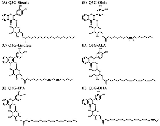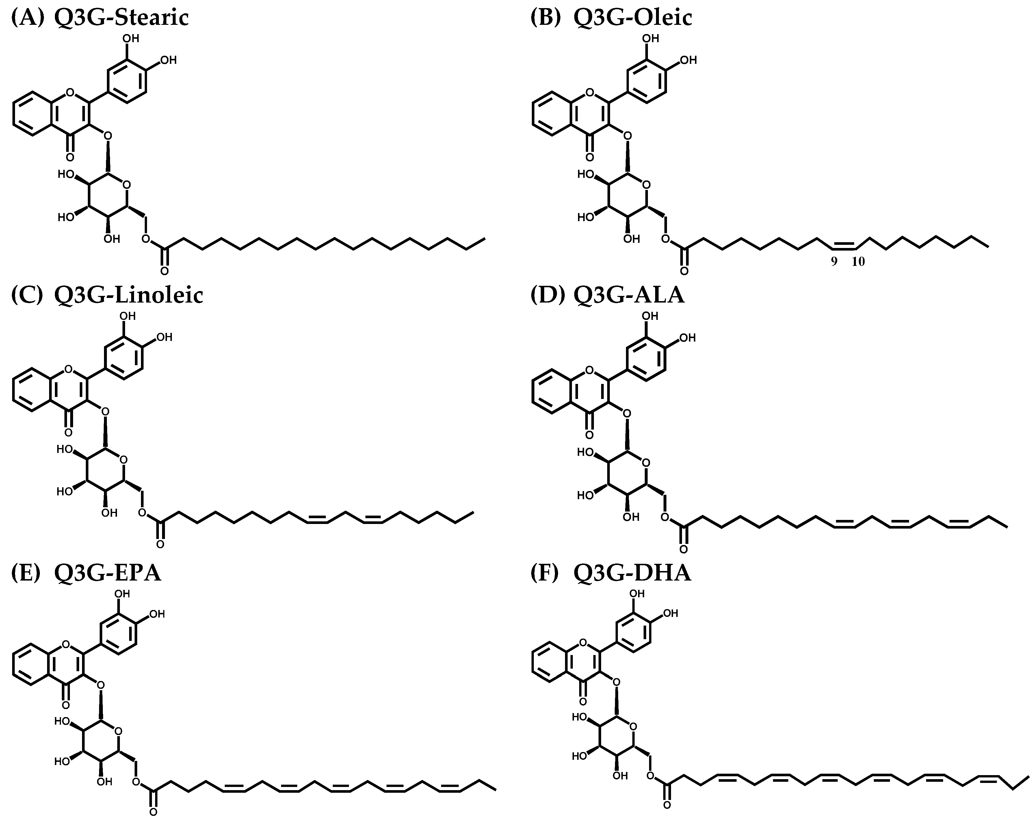 Chemical structures of six long chain fatty acid esters of quercetin-3-O-glucoside (Q3G). (A) Stearic acid ester of Q3G; (B) Oleic acid ester of Q3G; (C) Linoleic acid ester of Q3G; (D) α-linolenic acid (ALA) ester of Q3G; (E) eicosapentaenoic acid (EPA) ester of Q3G; (F) docosahexaenoic acids (DHA) ester of Q3G.