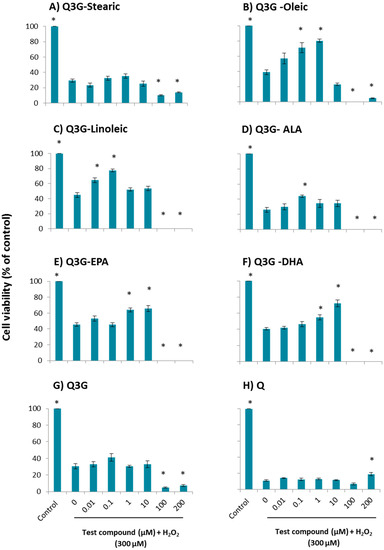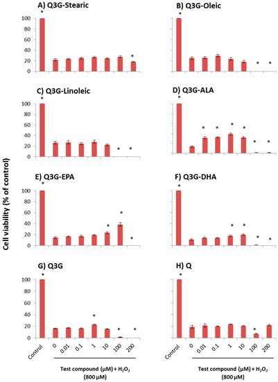 Dose-dependent cytoprotective effect of test compounds against H2O2-induced cytotoxicity in WI-38 cells. (A) Stearic acid ester of Q3G; (B) Oleic acid ester of Q3G; (C) Linoleic acid ester of Q3G, (D) ALA ester of Q3G; (E) EPA ester of Q3G; (F) DHA ester of Q3G; (G) Q3G and (H) Quercetin (Q). Cells were pre-incubated for 48 h followed by incubation with 800 µM H2O2 for 3 h. Cell viability is presented as percentage related to the control. Control contains cells with no incubation of test compounds and no oxidative injury. Data are expressed as mean ± SEM (n = 6). * p ≤ 0.05, significantly different from model group. The cells in the model group were subjected to oxidative injury by H2O2, but not treated with any test compounds.