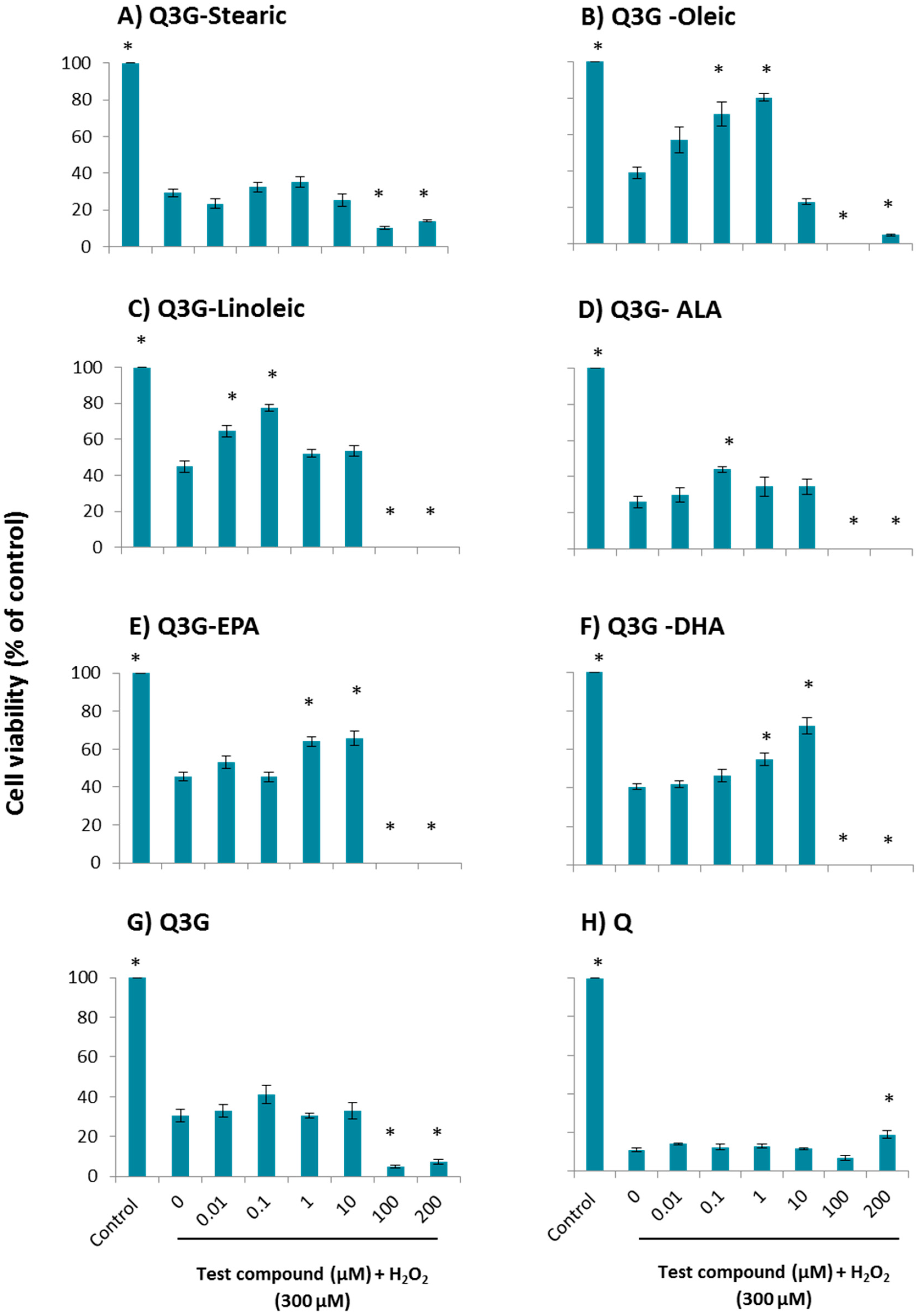 Dose-dependent cytoprotective effect of test compounds against H2O2-induced cytotoxicity in human primary hepatocytes. (A) Stearic acid ester of Q3G; (B) Oleic acid ester of Q3G; (C) Linoleic acid ester of Q3G; (D) ALA ester of Q3G; (E) EPA ester of Q3G; (F) DHA ester of Q3G; (G) Q3G and (H) Quercetin. Cells were pre-incubated for 48 h followed by incubation with 300 µM H2O2 for 3 h. Cell viability is presented as percentage related to the control. Control contains cells with no incubation of test compounds and no oxidative injury. Data are expressed as mean ± SEM (n = 6). * p ≤ 0.05, significantly different from model group. The cells in model group were subjected to oxidative injury by H2O2, but not treated with any test compounds.