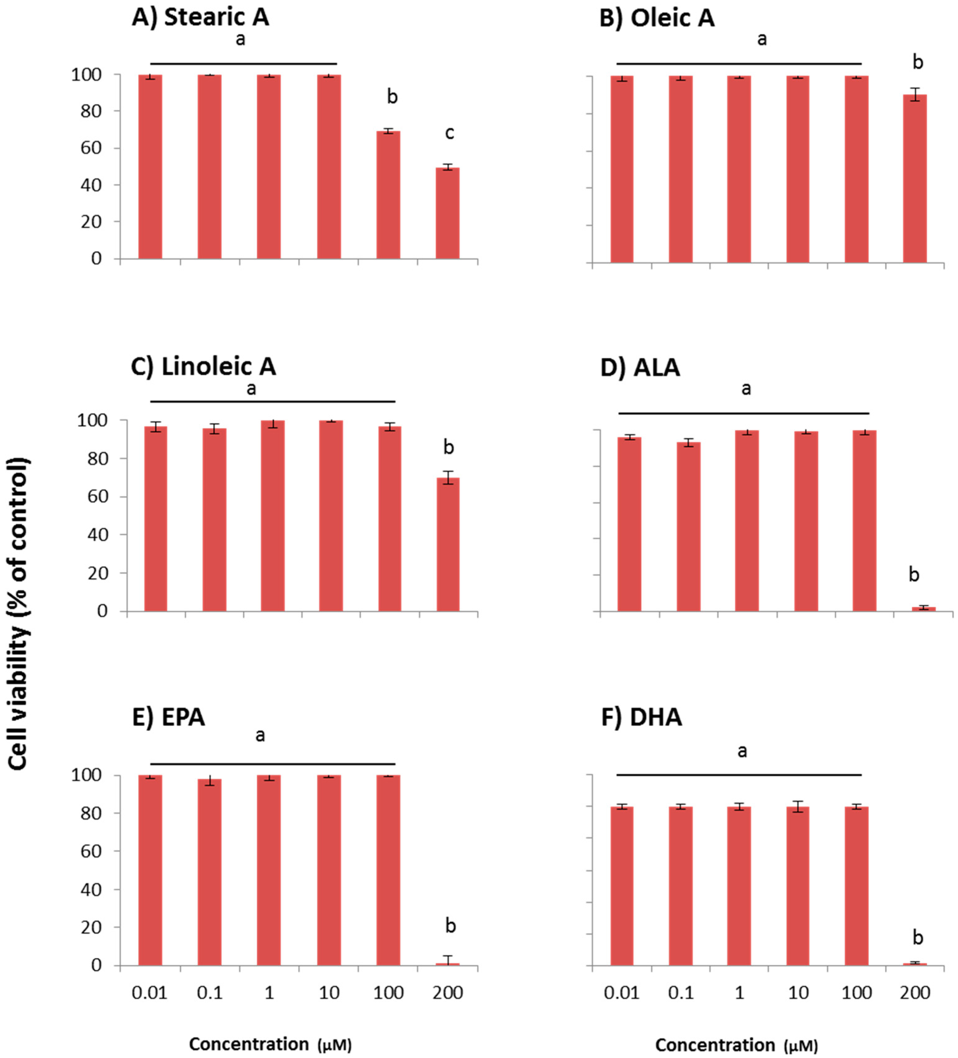 Dose-dependent cytotoxic effect of free fatty acids in WI-38 cells; (A) Stearic acid; (B) Oleic acid; (C) Linoleic acid; (D) ALA; (E) EPA; (F) DHA. Cells were pre-incubated with free fatty acids for 48 h. Cell viability was presented as percentage related to the control. Control contains cells with no incubation of free fatty acids. Data are expressed as mean ± SEM (n = 6), means sharing the same letter within compound are not significantly different (p ≤ 0.05).