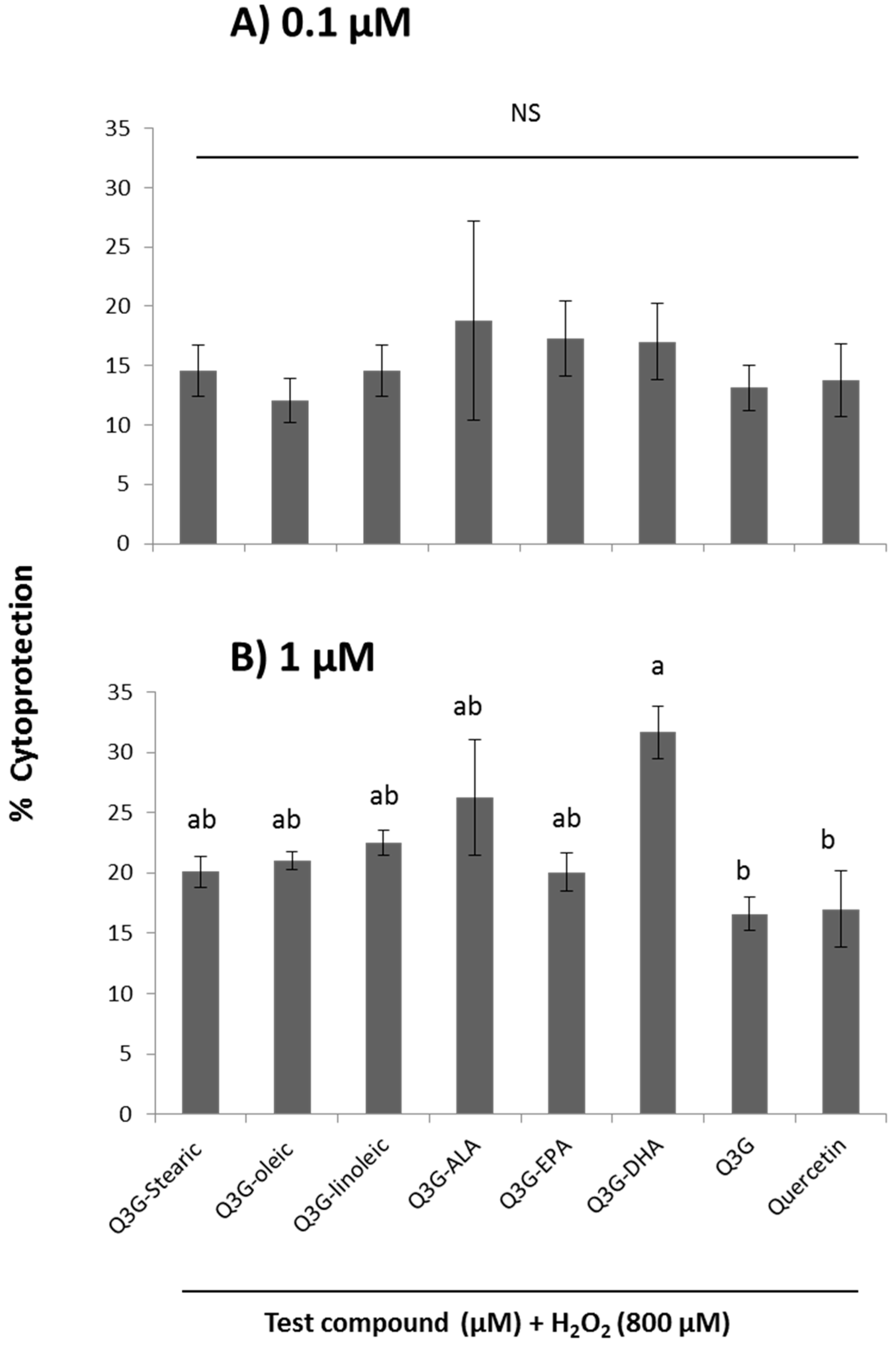 Dose-dependent cytoprotective effect of six fatty acid esters of Q3G, Q3G and quercetin using release of LDH under H2O2-induced oxidative injury in WI-38 cells. Cells were pre-incubated with test compounds at 0.1 µM (A) and 1 µM (B) followed by oxidative injury with H2O2 for 3 h. Data were expressed as mean ± SEM (n = 3), means sharing the same letter within concentration are not significantly different (p ≤ 0.05).