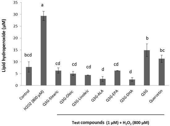 All the fatty acid esters of Q3G at 1 µM concentration, showed a significantly (p ≤ 0.05) lower production of lipid hydroperoxides compared to the H2O2 injury control (Figure 7). The decrease in lipid peroxidation by the esters was in a range of 22%–27% and ALA and DHA ester showed the highest effectiveness in inhibiting the cellular lipid peroxidation. Q3G and quercetin showed 15% and 18% decrease in the production of lipid hydroperoxides, respectively.