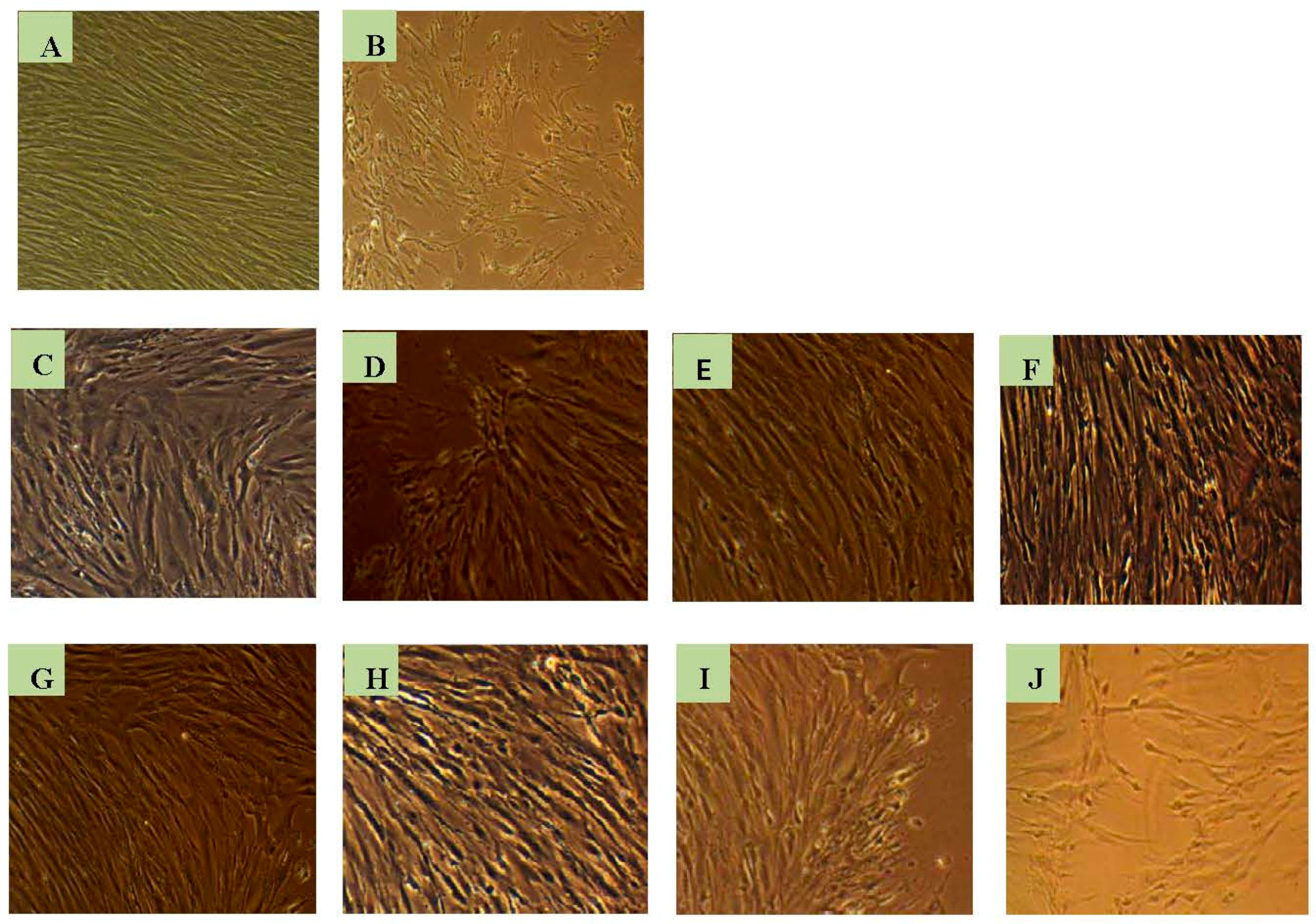 Morphological changes of WI-38 cells under an inverted phase contrast microscope (10×). (A) Control with no treatments; (B) Cells incubated only with H2O2 (800 µM) for 3 h. Images C to J represent the cells pre-incubated with test compounds for 48 h followed by H2O2-induced oxidative injury: (C) Stearic acid derivative of Q3G; (D) Oleic acid derivative of Q3G; (E) Linoleic acid derivative of Q3G; (F) ALA derivative of Q3G; (G) EPA derivative of Q3G; (H) DHA derivative of Q3G; (I) Q3G and (J) Quercetin.