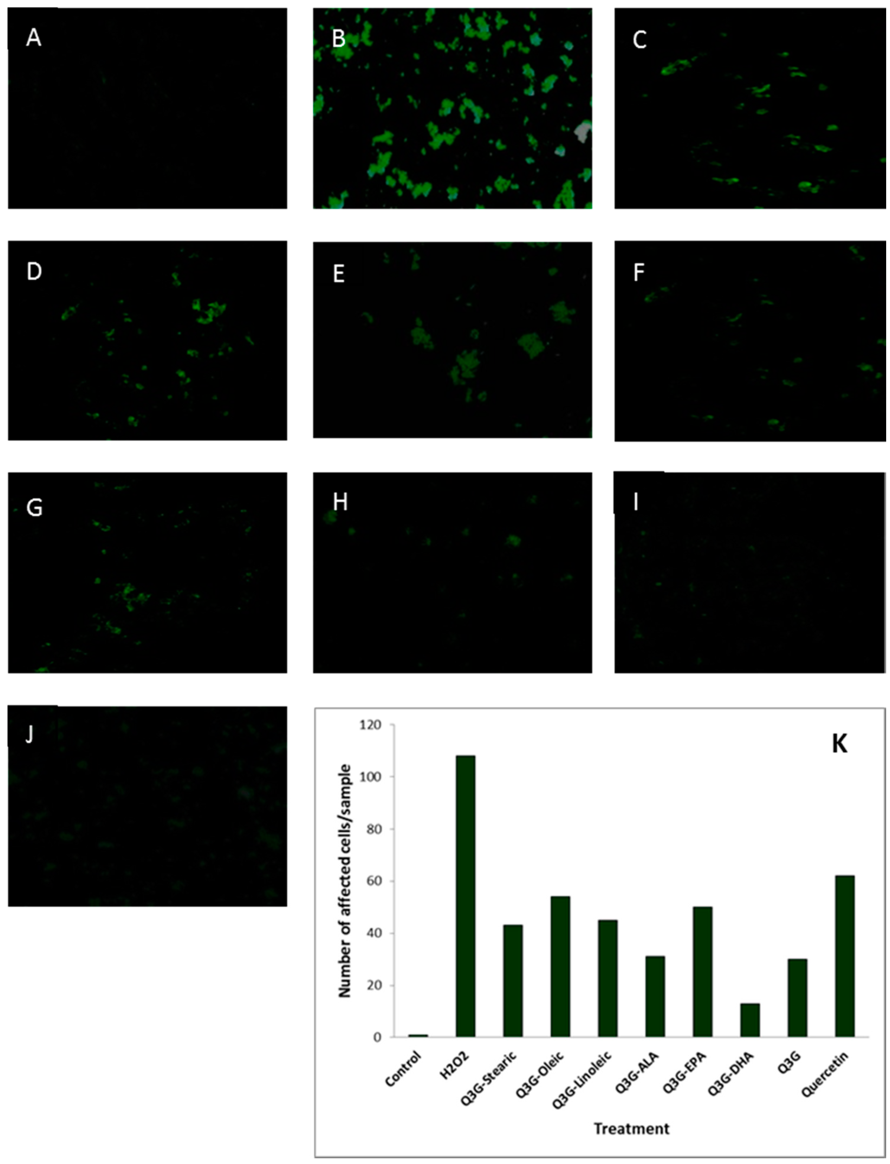 Effect of test compounds on H2O2-induced apoptotic cell death of WI-38 cells. (A) Untreated control; (B) Cells treated only with H2O2; (C) Stearic acid ester of Q3G, (D) Oleic acid ester of Q3G; (E) Linoleic acid ester of Q3G; (F) ALA ester of Q3G; (G) EPA ester of Q3G; (H) DHA ester of Q3G; (I) Q3G; (J) Quercetin; (K) Number of apoptotic cells in relation to the treatments. Cells were pre-incubated with test compounds for 48 h and then subjected to oxidative injury by 3 h incubation with H2O2. Cells were rinsed with PBS, stained with Annexin V and observed under a fluorescence microscope.