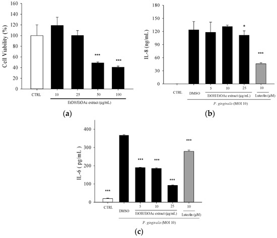The ethanol/ethyl acetate (EE) extract of WBM leaf at concentration of 25 µg/mL was not cytotoxic toward THP-1 cells (Figure 1a). Luteolin, up to 20 μM, had no significant cytotoxicity toward THP-1 cells [20]. At the non-cytotoxic concentrations, treatment of ethanol/ethyl acetate extract significantly decreased P. gingivalis-induced IL-8 and IL-6 productions (Figure 1b,c).