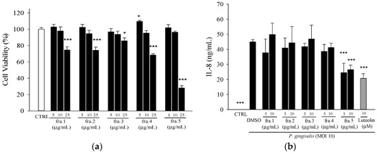 In order to begin the process of identifying the active compounds, the EE extract was divided into five fractions, which were then tested for the inhibitory effect against P. gingivalis-induced IL-8 production. Of the five fractions, Fra. 5 significantly inhibited IL-8 levels at concentrations of 5 and 10 µg/mL, which are not cytotoxic toward THP-1 cells (Figure 2).
