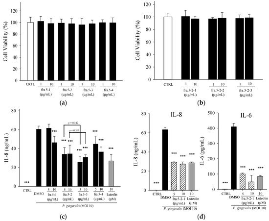 Effects of sub-fractions obtained from the active fraction, Fraction 5, on P. gingivalis-induced cytokines in THP cells. (a,b) Cell viability was determined by MTT assay; (c,d) IL-8 or IL-6 level was determined in THP-1 cells co-incubated with P. gingivalis (M.O.I. = 10) and the indicated concentrations of samples for 24 h. Luteolin was a positive control. A control experiment (CTRL) without P. gingivalis treatment was conducted in parallel. Each column shows the mean ± SD of three independent experiments, each done in quadruplicate. *** p < 0.001 vs. DMSO vehicle (P. gingivalis alone).