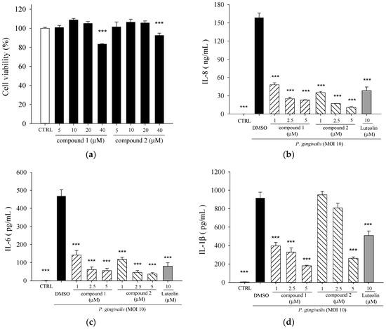 The dried EE extract, sub-fractions and compounds (1 and 2) were reconstituted in dimethyl sulfoxide (DMSO) for the subsequent experiments. THP-1 cells (2 × 106 cells/mL) were seeded in 96-well plates with serum-free medium, and were stimulated with heat-killed P. gingivalis (M.O.I. = 10) alone or in combination with different concentrations of tested samples or luteolin for a 24-h incubation. Cell-free supernatants were collected, and concentrations of IL-6, IL-8, and IL-1β were analyzed with respective enzyme immunoassay kits (Invitrogen, Carlsbad, CA, USA). Luteolin has also been reported to block P. gingivalis LPS-mediated COX-2 expression by inhibiting the activation of MAPK phosphorylation in human gingival fibroblasts [48] and, thereby, was used in this study as a positive control.
