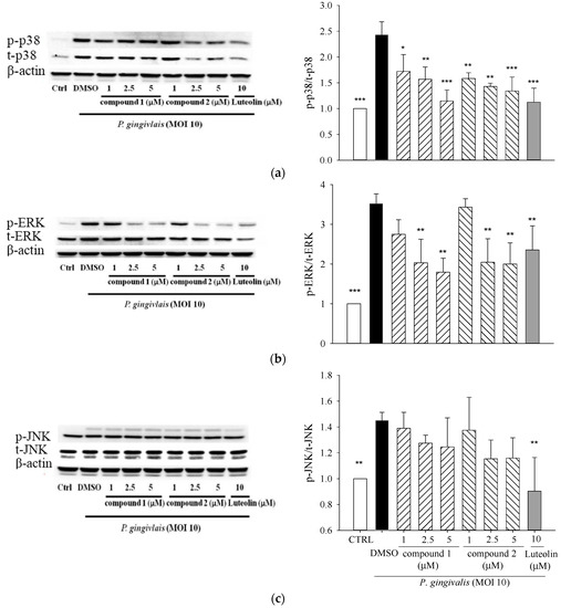 To elucidate the underlying anti-inflammatory mechanism, we evaluated the inflammation-related signaling cascades, MAPK including extracellular signal-related kinase (ERK), p38-mitogen-activated kinase (p38), and c-Jun N-terminal kinase (JNK). The levels of phosphorylated p38, ERK, and JNK were measured by Western blot. Our preliminary study showed that the levels of phosphorylated of MAPKs significantly increased at 15 min, peaked at 30 min, and then declined to control levels at 2 h after P. gingivalis stimulation. In the subsequent experiments, the levels of phosphorylated p38, JNK, and ERK were evaluated after 30 min of stimulation. Treatments of compounds 1 and 2 markedly decreased P. gingivalis-induced phosphorylation of p38 (Figure 5a) and ERK (Figure 5b) but did not significantly change JNK activation (Figure 5c).