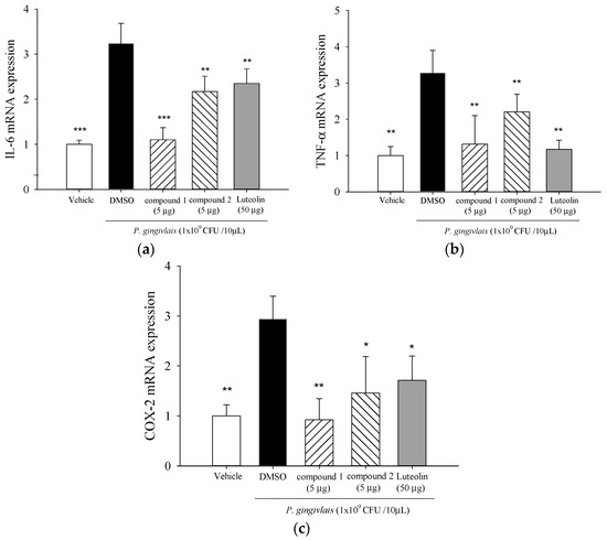 Six-week-old male C57BL/6 mice were obtained from the National Laboratory Animal Center (Taipei, Taiwan). The mice were housed in groups of five per cage, under standard temperature-controlled conditions with a 12 h/12 h light-dark cycle and free access to food and water throughout the experiments. All animal experiments were conducted in accordance with the Guide for the Care and Use of Laboratory Animals and were approved by the Animal Care Committee of the National Taiwan Normal University. Throughout the period of the study mice were fed with sterile standard solid mice chow diet and sterile water. Periodontitis was induced by an intra-gingival injection of P. gingivalis according to the method by de Molon et al. [49] with some modifications. After ONE week of adaptation, animals were randomly divided into five groups (n = 5). Heat-killed P. gingivalis (1 × 109 CFU in PBS) or PBS (as vehicle control) was injected once daily into the mandibular (lower inset) gingival tissues of mice for three days. To study the effects of compounds 1 and 2, they were respectively administered once daily for three days with co-injection of heat-killed P. gingivalis suspensions. After 14 days of bacterial injection, mice were then sacrificed with carbon dioxide asphyxiation. The gingival tissues were excised for the extraction of total RNA for reverse transcription qualitative polymerase chain reaction (RT-qPCR).