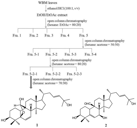The WBM leaf extract was prepared using a procedure described by Huang et al. [20], with some modification. As shown in Figure 7, dried and powdered WBM leaves (300 g) were extracted twice with 3 L of ethanol/HCl (100:1, v/v) at room temperature on a rotary shaker at 200 rpm in the dark for 24 h. The blended mixture was then centrifuged at 5000 g. The supernatant obtained was filtered, and then evaporated to dryness under reduced pressure (45–50 °C). The residue was re-dissolved in 25 mL of water/ethanol (80:20, v/v) and extracted four times with 25 mL of ethyl acetate in a separatory funnel. The organic fractions were combined, dried for 30–40 min with anhydrous sodium sulfate, and filtered through a Whatman-40 filter, and evaporated to dryness under vacuum (45–50 °C) to obtain the ethanol/ethyl acetate (EE) extract. A yield of EE extract was 12.2% of the original weight. The EE extract was stored in the dark at −20 °C. Next, the EE extract (120 mg) was dissolved in ethyl acetate and then subjected to chromatographic separation on the open column of silica gel (Silicycle 230−400 mesh) in a small scale pretest using hexane: ethyl acetate (80:20) as eluent, and fractions of 5 mL were collected. The collected fractions were based on their TLC patterns as follow: Fraction 1 (7 mg), Fraction 2 (2 mg), Fraction 3 (5 mg), Fraction 4 (8 mg), and Fraction 5 (50 mg). All extracts were stored in the refrigerator before use. All of the Fraction 5 (25.7 g) were further chromatographed on a silica gel column (35 mm × 45 cm), eluted with hexane: acetone (80:20) to give four fractions (about 1.6 g, 3.9 g, 1.5 g, and 17 g, respectively). Fraction 5-2 (3.9 g) was subjected to the open column of silica gel using n-hexane–acetone (50:50) as eluent and to give three fractions. Fraction 5-2-1 (2.9 g) was subjected to the silica gel column eluted with n-hexane-acetone (70:30) and to yield 5β,19-epoxycucurbita-6,23-diene-3β,19,25-triol (1; 130 mg) and 3β,7β,25-trihydroxycucurbita-5,23-dien-19-al (2; 390 mg). Nuclear magnetic resonance (1H-NMR and 13C-NMR) techniques were used for the structure elucidation of the compounds. NMR spectra were recorded on a Bruker spectrometer (600 MHz for 1H-NMR and 150 MHz for 13C-NMR) instrument, and using CDCl3 as solvent. The isolates were identified as 5β,19-epoxycucurbita-6,23-diene-3β,19,25-triol (1), and 3β,7β,25-trihydroxycucurbita-5,23-dien-19-al (2) by comparison of their spectroscopic data with those of published in the related references [44,45]. The 1H-NMR and 13C-NMR, DEPT, COSY, HSQCAD, and HMBCAD spectral data of the two pure compounds obtained in this investigation are available as Supplementary Figures.