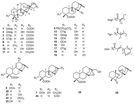 Nineteen known ent-kaurane derivatives, namely 16α-hydroxy-ent-kauran-19-oic acid (8) [10], 16α-methoxy-17-hydroxy-ent-kauran-19-oic acid (9) [11], 16α-17-dihydroxy-ent-kauran-19-oic acid (10) [12], 16α, 18-dihydroxy-ent-kaurane (11) [13], 3α-tigloyloxypterokaurene L3 (12) [14], 3α-angeloyloxy-9β-hydroxy-ent-kaur-16-en-19-oic acid (13) [15], 3α-cinnamoyloxy-9β-hydroxy-ent-kaur-16-en-19-oic acid (14) [15], 3α-cinnamoyloxy-ent-kaur-16-en-19-oic acid (15) [12], 3α-hydroxy-ent-kaur-16-en-19-oic acid (16) [16], 3α-tiglinoyloxy-ent-kaur-16-en-19-oic acid ent-kaura-9 (17) [8], ent-9α-hydroxy-16-kauren-19-oic acid (18) [17], ent-15-oxokaur-16-en-19-oic acid (19) [18], (11),16-dien-19-oic acid (20) [19], 12α-hydroxy-ent-kaur-9(11),16-dien-19-oic acid (21) [20], 12α-methoxy-ent-kaur-9(11),16-dien-19-oic acid (22) [21], 3α-hydroxy-ent-kaura-9(11), 16-dien-19-oic acid (23) [21], ent-17-oxokaur-15-en-19-oic acid (24) [22], 15α,16α-epoxy-17-hydroxy-ent-kauran-19-oic acid (25) [12], and wedeliaseccokaurenolide (seco) (26) [14], were also isolated. Their structures were identified on the basis of spectroscopic analysis and comparison with reported data.