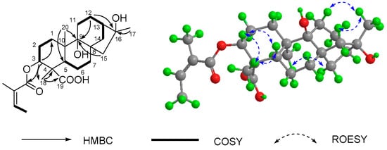 Apart from five carbon signals assigned to the angeloyloxy group (δC 167.9, 128.1, 138.6, 20.9, and 16.0), the 13C-NMR (DEPT) spectrum of 1 (Table 1) also exhibited 20 carbons composed of three methyls, eight methylenes, four methines (one oxygenated), and five quaternary carbons, which were consistent with a skeleton of an ent-kauranoid [9]. In particular, the NMR spectroscopic features of 1 are similar to those of 8 (16α-hydroxy-ent-kauran-19-oic acid), and only differed in the appearance of an angeloyloxy group at C-3 in 1. It was also confirmed by the chemical shift value of C-3 (δC 78.9, CH), C-9 (δC 56.1, CH) and the HMBC correlations (Figure 2) from H-3 (δH 4.50, dd, J = 12.2, 4.7 Hz) to C-1′ (δC 167.9, C), C-1 (δC 38.9, CH2), and C-18 (δC 24.7, CH3) as well as the correlations from Me-20, H-12, and H-15 to C-9, and from the methyl at C-4 (Me-18) to a downfield quaternary carbon (C-19) at δC 178.1. The ROESY correlations of H-3 with H-5 and H3-18 suggested that the angeloyloxy was α-orientated, and the hydroxy at C-16 was also assigned as α-orientated by the ROESY correlations of H3-17 with H2-11 and H-14β along with the ROESY correlations of H3-20 with H2-15. Consequently, the structure of 1 was finally determined as 3α-angeloyloxy-16α-hydroxy-ent-kauran-19-oic acid.