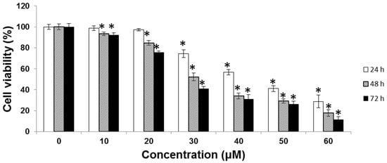 SK-Hep-1 cells (2 × 104 cells/well) were treated with various concentrations of UA (0, 10, 20, 30, 40, 50, and 60 μM) for 24, 48, or 72 h. Cell viability was measured using the MTT assay. The cytotoxicity of UA in SK-Hep-1 cells was dose-dependent. Each point is the mean ± SD of three experiments. * indicates significant difference from control, p < 0.001.