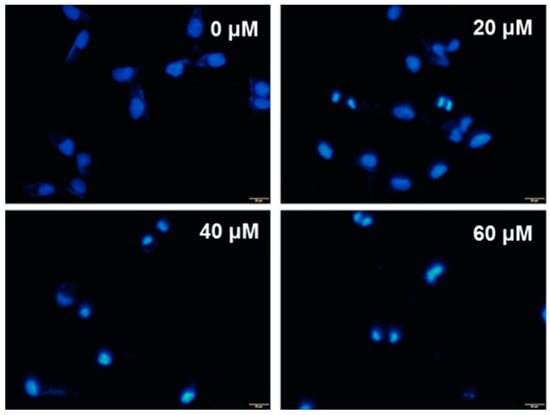 DAPI staining showing the effect of UA on chromatin condensation in SK-Hep-1 cells after treatment with 0, 20, 40, and 60 μM UA for 24 h. Images were obtained with an Olympus IX81 microscope.