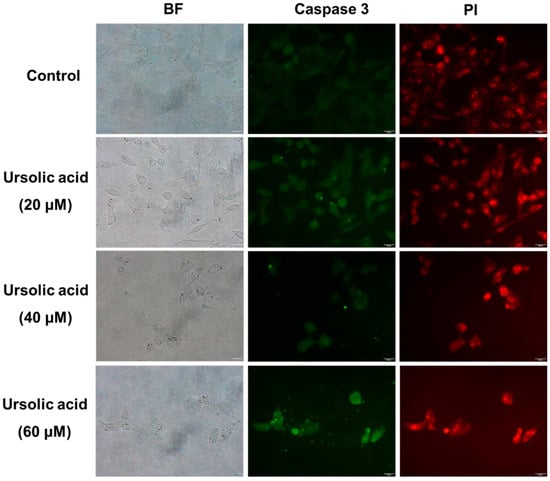 SK-Hep-1 cells were treated with various concentrations (0, 20, 40, and 60 μM) of UA for 24 h, after which they were washed with ice-cold PBS and then fixed with 4% paraformaldehyde in PBS for 30 min at 37 °C. Cells were then washed twice with ice-cold PBS and then incubated in 0.25% Triton X-100 in 0.1% BSA for 5 min at 4 °C. Cells were then washed twice with ice-cold PBS and then incubated with PBS containing 0.1% BSA for 1 h at room temperature to block non-specific binding. Thereafter, the cells were separately incubated with rabbit anti-caspase 3 (1:200) antibody in PBS containing 0.1% BSA overnight at 4 °C. After washing three times with PBS the cells were incubated with anti-rabbit FITC (1:500) in PBS containing 0.1% BSA for 1 h at room temperature. After washing three times with PBS, the nuclei were stained with 5 μg/mL PI. After staining, the samples were immediately examined under an Olympus IX81 microscope (Olympus, Tokyo, Japan).