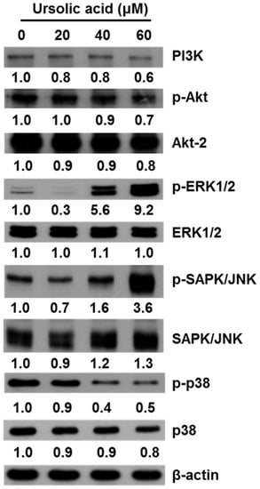 The mitogen-activated protein kinase (MAPK) pathway, which includes the signaling molecules ERK, JNK and p38, plays a critical role in cell proliferation, growth, differentiation, migration, and apoptosis [27]. To examine the molecular mechanisms of UA on apoptosis in SK-Hep-1 cells, we used western blot to detect the expression of PI3K, p-Akt, Akt-2, p-ERK1/2, ERK1/2, p-JNK, JNK, p-p38, and p38. We found that cells treated with various concentrations of UA (20, 40, and 60 μM) for 24 h had significantly higher levels of p-ERK1/2 and p-JNK protein expression than untreated controls and decreased the level of PI3K, p-Akt and p-p38 (Figure 8).