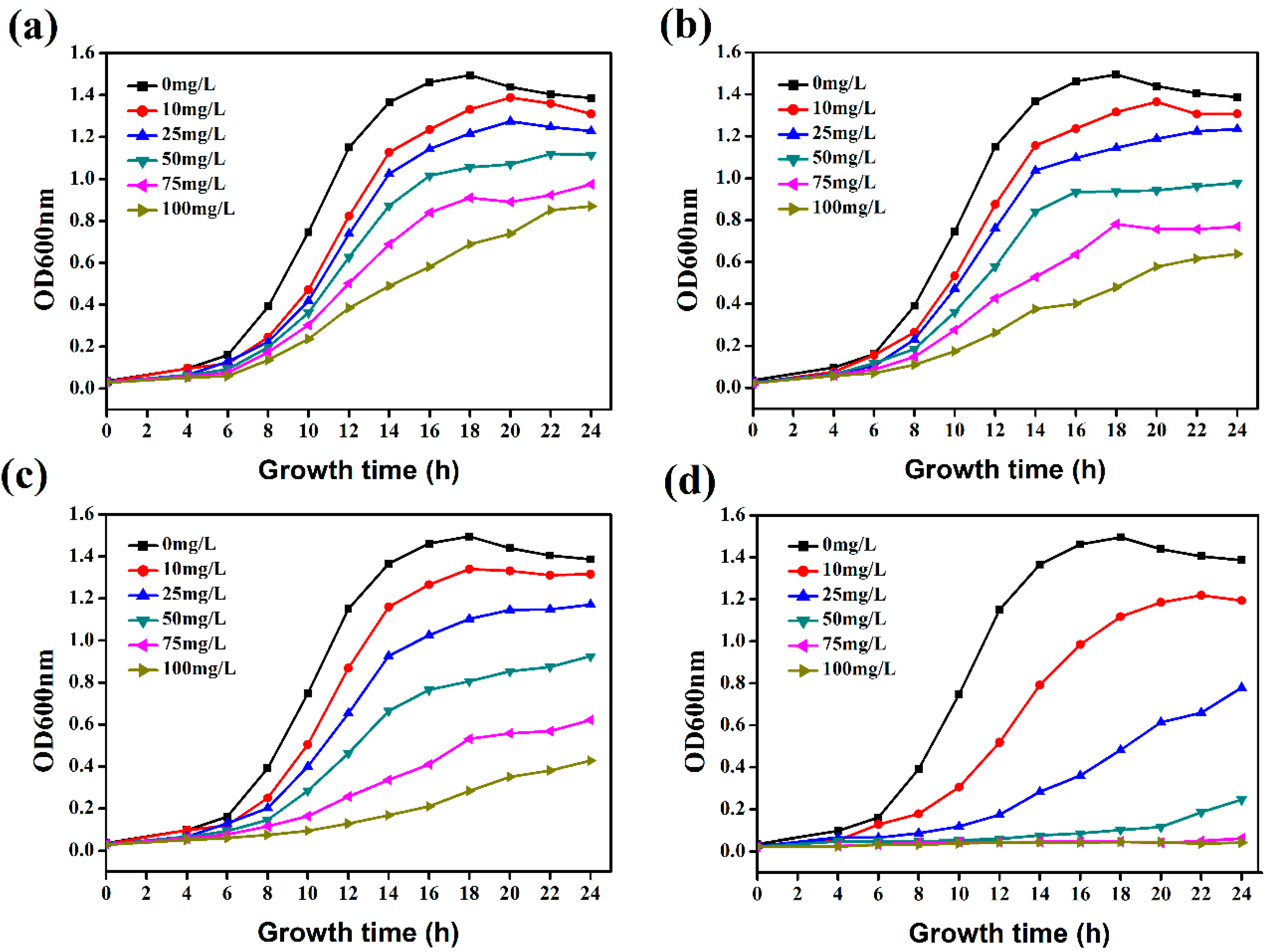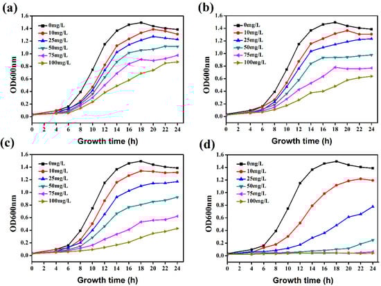 The effect of coumarins at concentrations ranging from 10 to 100 mg/L on the growth curves of R. solanacearum: (a) coumarin; (b) umbelliferone; (c) esculetin; (d) daphnetin.