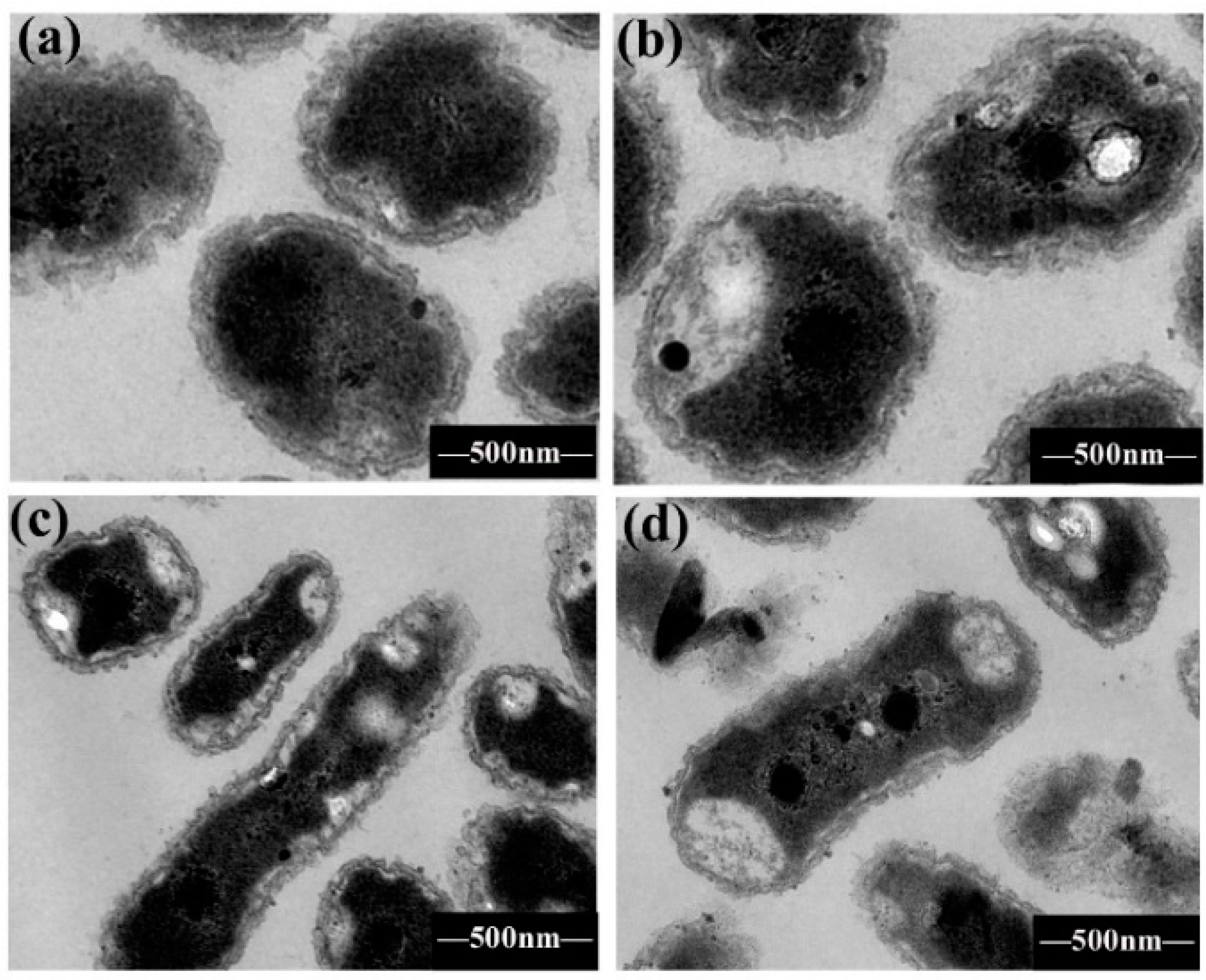 TEM images of R. solanacearum cells treated with (a) DMSO; (b) umbelliferone; (c) esculetin; and (d) daphnetin, respectively. Overnight cultured bacterial suspension was diluted into B medium supplemented with coumarins (50 mg/L umbelliferone, 50 mg/L esculetin and 25 mg/L daphnetin) and incubated at 30 °C for 12 h.