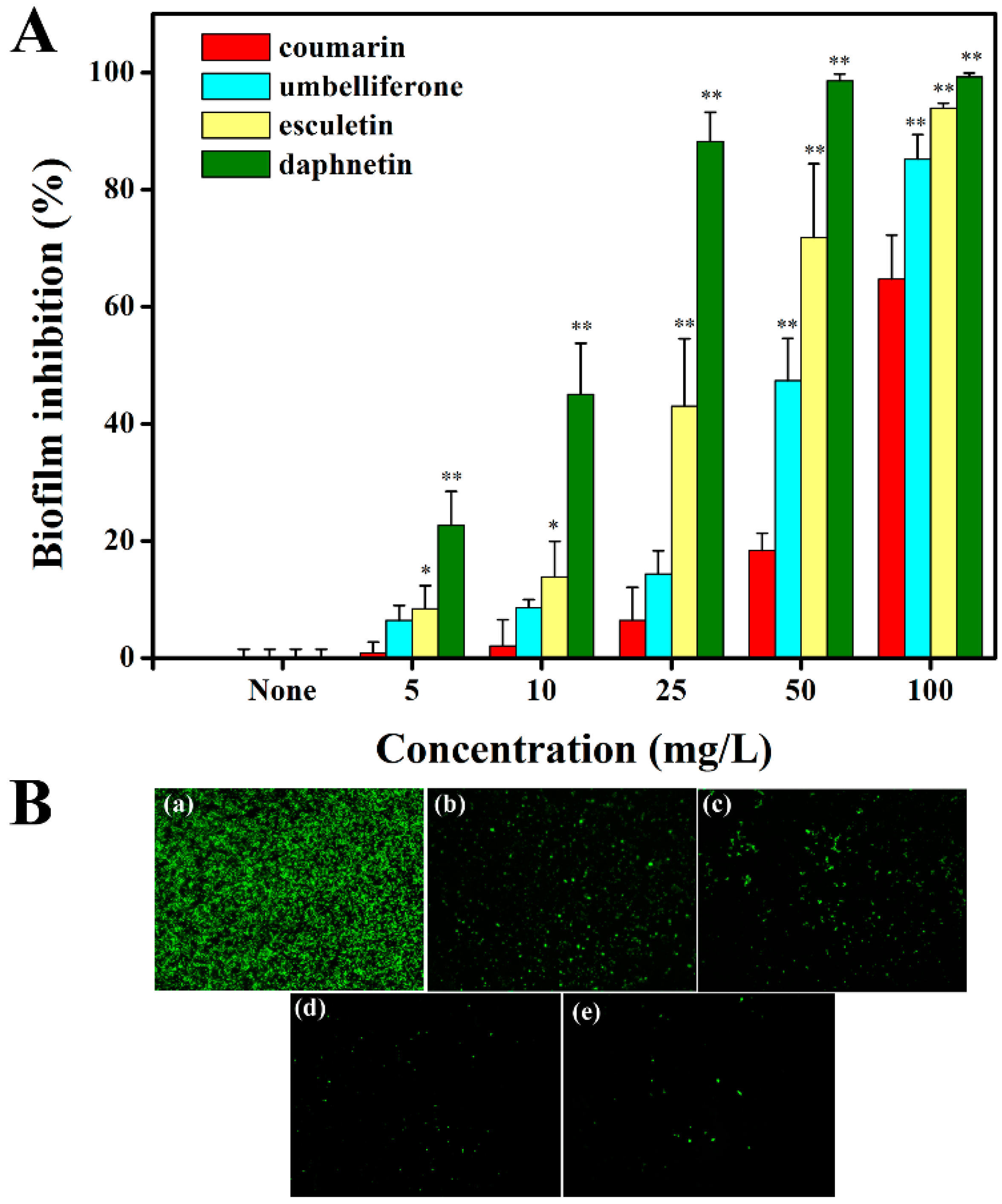 Effects of coumarins on biofilm formation of R. solanacearum. Biofilm inhibition (%) was quantified after treatment with different concentrations of coumarins at 30 °C for 24 h in the 96-well plates (A); (* indicated p < 0.05, ** indicated p < 0.01). Fluorescence microscope imaging of biofilm formation of R. solanacearum using FITC-ConA tagged with extracellular polysaccharide in 24-well polystyrene microtiter plate (B); Fluorescence microscope imaging of R. solanacearum with (a) 50 mg/L DMSO (control treatment); (b) coumarin (50 mg/L); (c) umbelliferone (50 mg/L); (d) esculetin (50 mg/L); (e) daphnetin (50 mg/L).