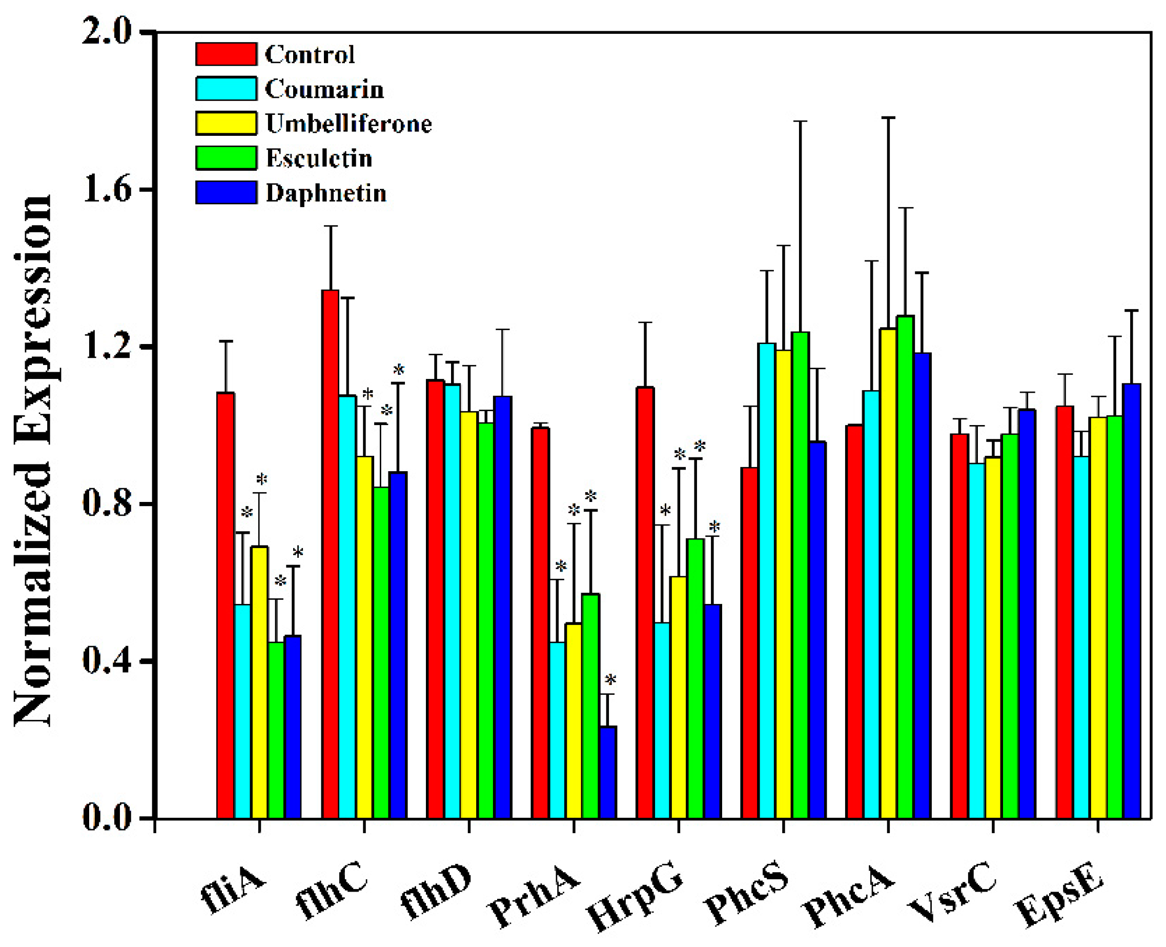 Thanks to our increasing knowledge about R. solanacearum, the virulence-associated genes were comprehensively and thoroughly studied in previous studies [38,39]. For example, the regulating and structural flagellar genes, fliA, flhC and flhD, participate in the regulation of swimming motility of R. solanacearum [40]. In a preliminary study, we found that hydroxycoumarins, especially daphnetin, repressed the swimming motility and reduced the biofilm formation. In order to investigate the molecular mechanism responsible for swimming motility and biofilm inhibition, we measured the expression of the main virulence-associated genes in R. solanacearum cells treated or not with coumarins using qRT-PCR. The results indicated that the expression of fliA and flhC was significantly repressed by umbelliferone, esculetin, and daphnetin (Figure 5), but the hydroxycoumarins did not have effect on flhD and VsrC which also contribute to the swimming motility of R. solanacearum. This result implied that coumarins (umbelliferone, esculetin, and daphnetin) reduce biofilm formation through repressing the swimming motility by repressing some flagellar genes.