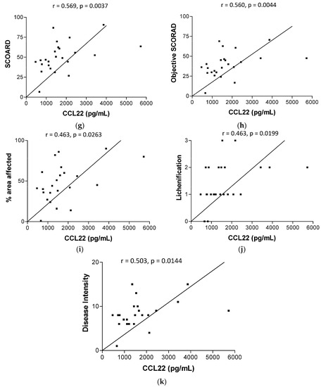 - Hashimoto, S.; Nakamura, K.; Oyama, N.; Kaneko, F.; Tsunemi, Y.; Saeki, H.; Tamaki, K. Macrophage-derived chemokine (MDC)/CCL22 produced by monocyte derived dendritic cells reflects the disease activity in patients with atopic dermatitis. J. Dermatol. Sci. 2006, 44, 93–99. [Google Scholar] [CrossRef] [PubMed]
