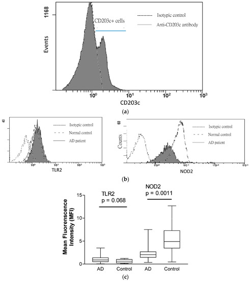 3.2. Flow Cytometric Analysis for TLR2 and NOD2 Expression in CD203+ Basophils from AD Patients and Controls