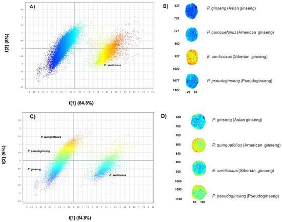 The use of HSI to determine chemical variation between the different ginseng species yielded the results presented in Figure 1A–D.