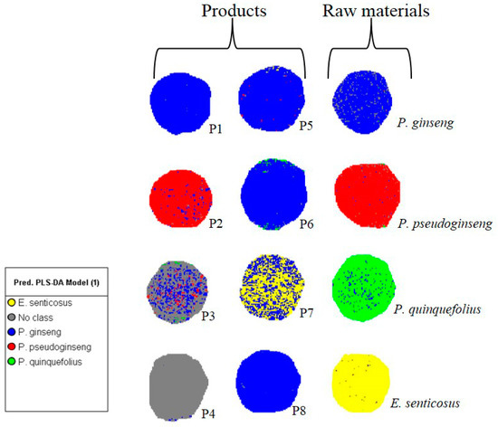 Classification of raw material constituents in commercial ginseng products as determined from predicted pixel abundance using the PLS-DA model based on HSI data.