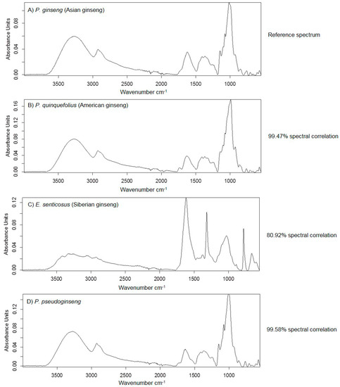 Spectral correlation of different ginseng species to P. ginseng “reference” material. (A) The reference material Panax ginseng; (B) Panax quinquefolius; (C) Eleutherococcus senticosus and (D) Panax pseudoginseng.