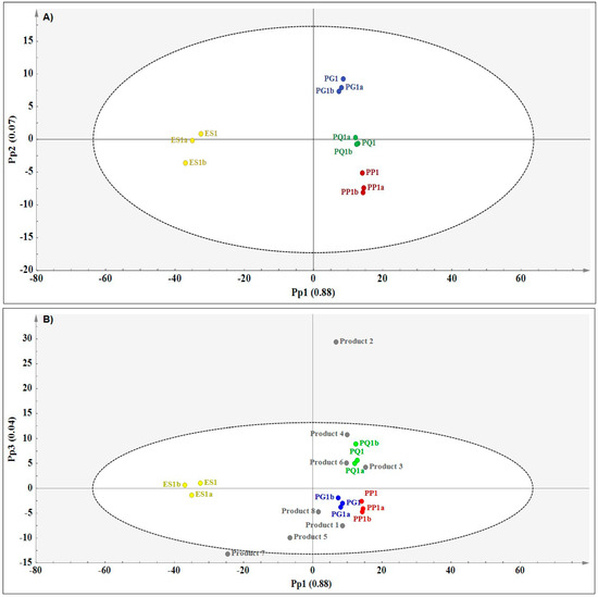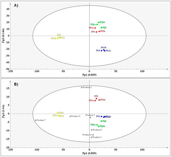 (A) OPLS-DA score plot (Pp1 vs. Pp2) showing species separation (PG—P. ginseng (blue); PG—P. quinquefolius (green); PP—P. pseudoginseng (red) and ES—E. senticosus (yellow) and (B) prediction plot (Pp1 vs. Pp3) showing the relationships between the authentic reference materials and the commercial products based on NIR data.