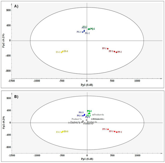 (A) OPLS-DA score plot (Pp1 vs. Pp2) showing species separation (PG—P. ginseng (blue); PQ—P. quinquefolius (green); PP—P. pseudoginseng (red) and ES—E. senticosus (yellow) and (B) prediction plot (Pp1 vs. Pp2) showing the relationships between the authentic reference materials and the commercial products based on MIR data.