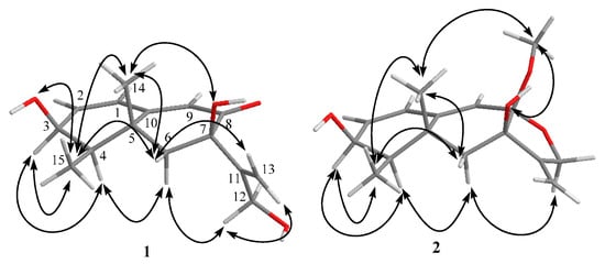 Key NOE correlations of 1 and 2.