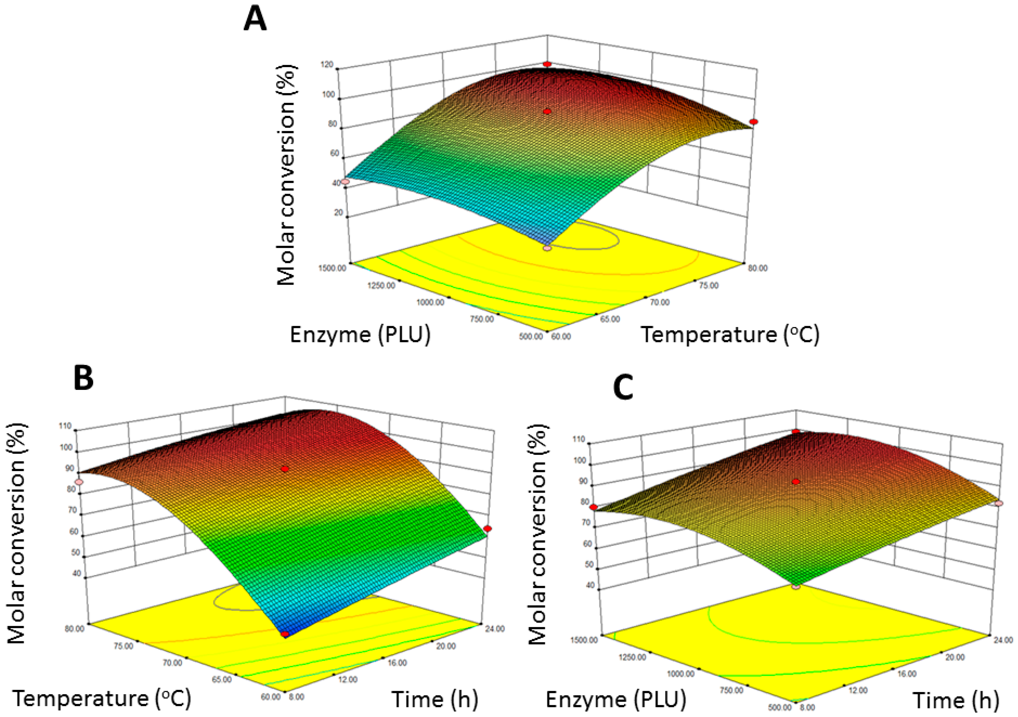 Response surface plot for the relationships between molar conversion and experimental variables. Response surface plot showing the relationships between molar conversion of 2-ethylhexyl ferulate and reaction parameters: (A) reaction temperature and enzyme amount; (B) reaction temperature and reaction time and (C) reaction time and enzyme amount.
