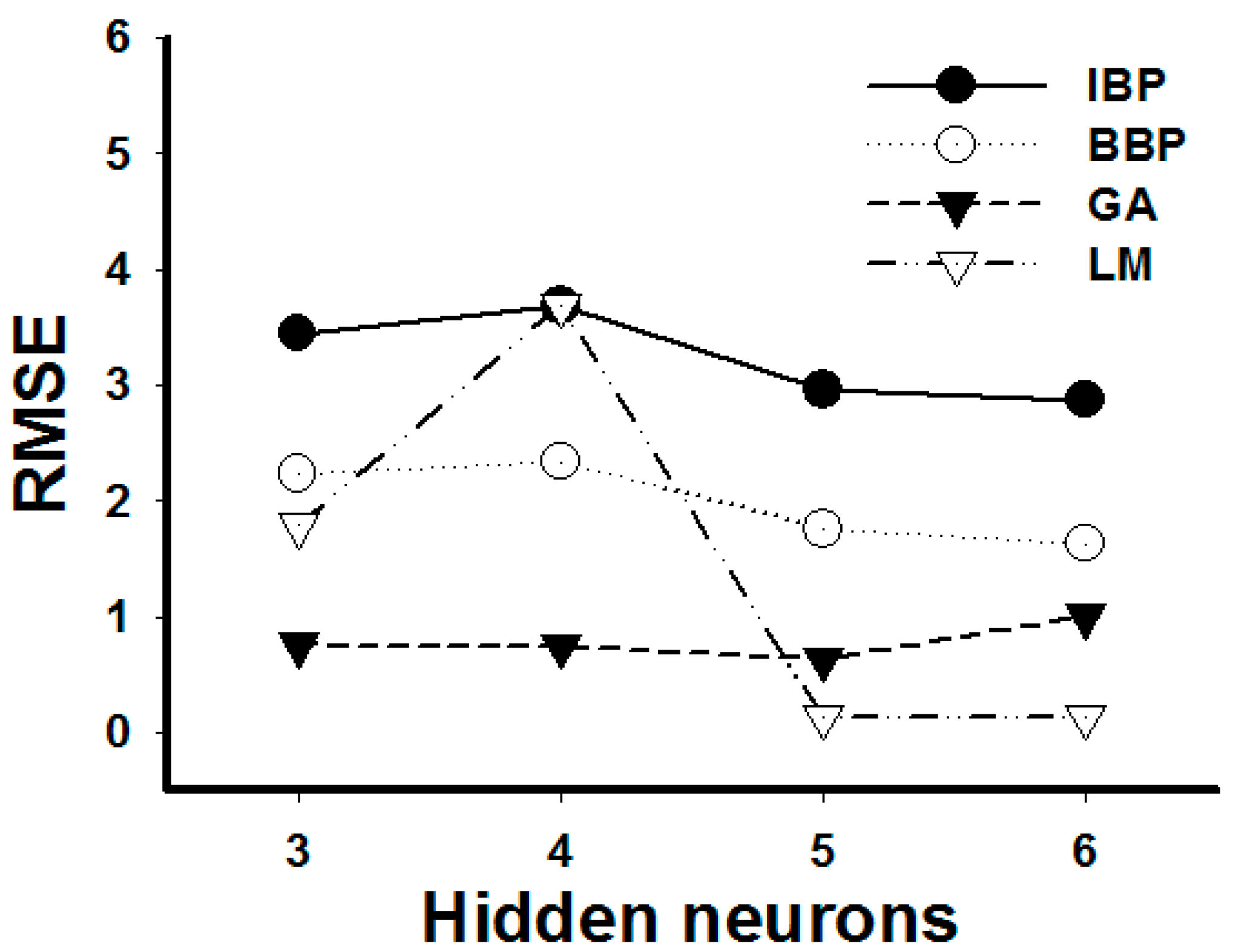 Learning curves of ANN model at different hidden neurons. The training set uses sigmoid transfer function in the hidden layer and output layer based on increment back propagation (IBP), batch back propagation (BBP), Levenberg-Marquardt algorithm (LM) or genetic algorithm (GA).