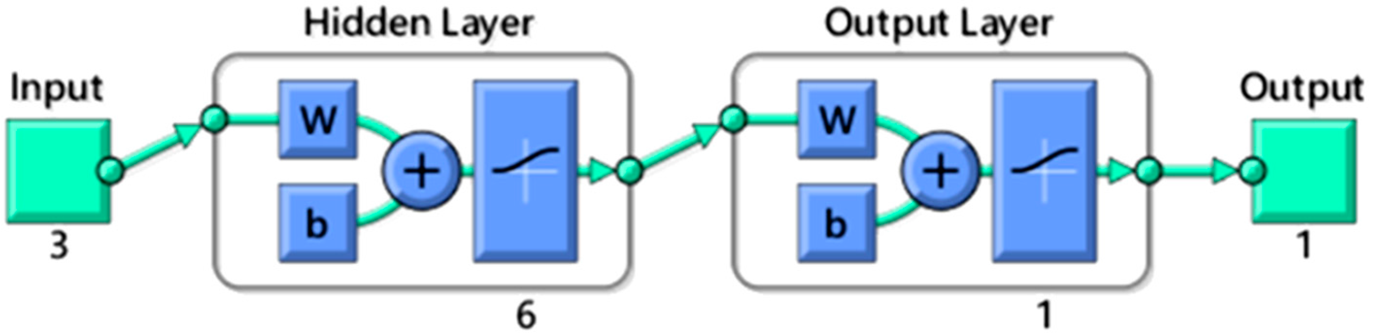 All results from the test were evaluated statistically based on the RMSE values. According to Figure 2, the best performance network was trained using a LM algorithm with a sigmoid transfer function, which exhibited a lower and stable RMSE. It is noted that the curve of the RMSE levels off at five hidden neurons. Therefore, the best ANN model in this study is determined to be a multilayer feed forward connection, trained by a LM algorithm using a sigmoid transfer function that consists of a 3–6–1 topology, as shown in Figure 3. This learning was acquired with RMSE = 0.79, R2 = 0.99.