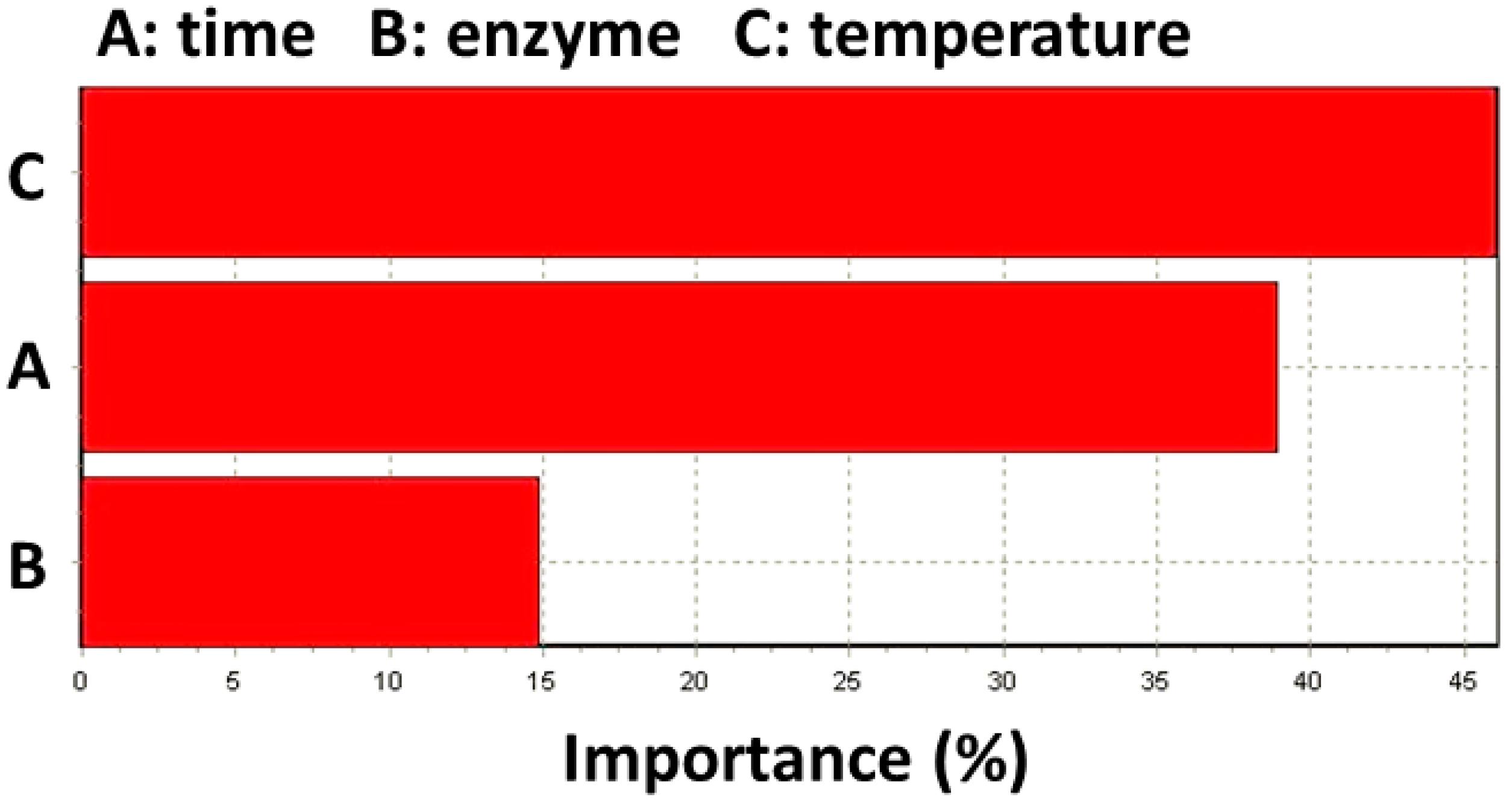 According to Figure 4, the reaction time and reaction temperature displayed great impact on the conversion with a relative importance of approximate 39% and 46%, respectively. These results are in accordance with the ones obtained with RSM.