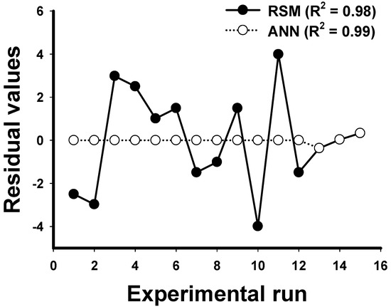 The distribution of residual values for each experimental run of Box-Behnken design experiments employing the RSM and ANN models. Coefficient of determination (R2) calculated from the design data for RSM and ANN models were 0.98 and 0.99, respectively. Residual values: predicted values minus actual values.